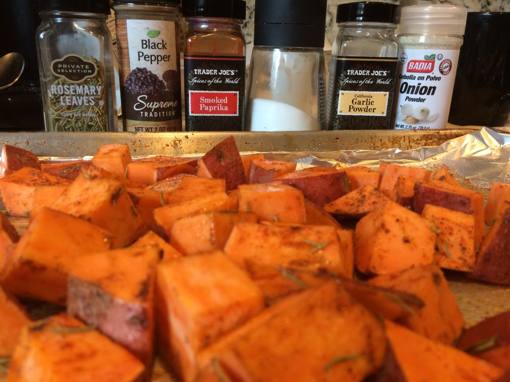 Cooking sweet potatoes can be tricky. Something to remember about sweet potatoes is they sweat more than white potatoes and they take a heck of a lot longer to cook. A couple more important things to keep in mind when cooking these delicious bits of yummy are oven temperature, rack placement, oil choice and seasoning.